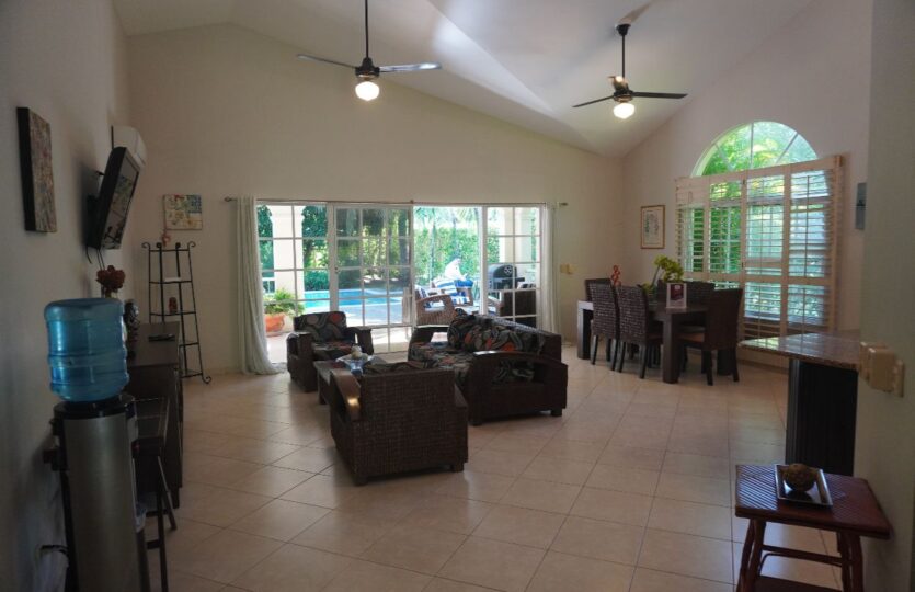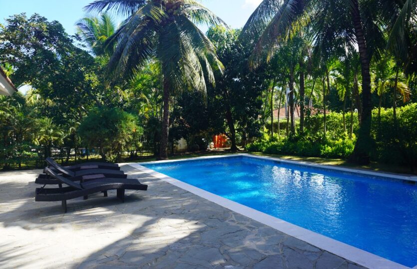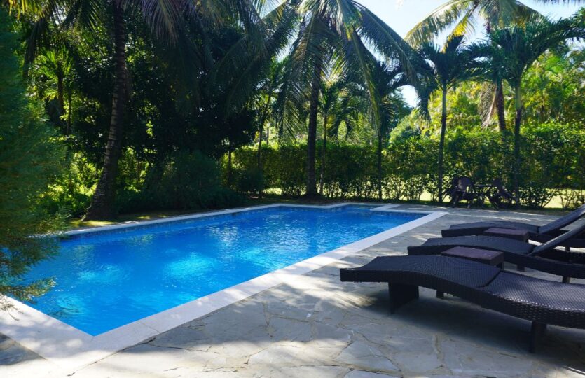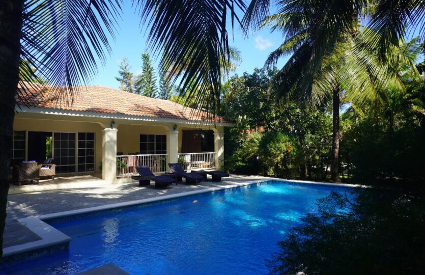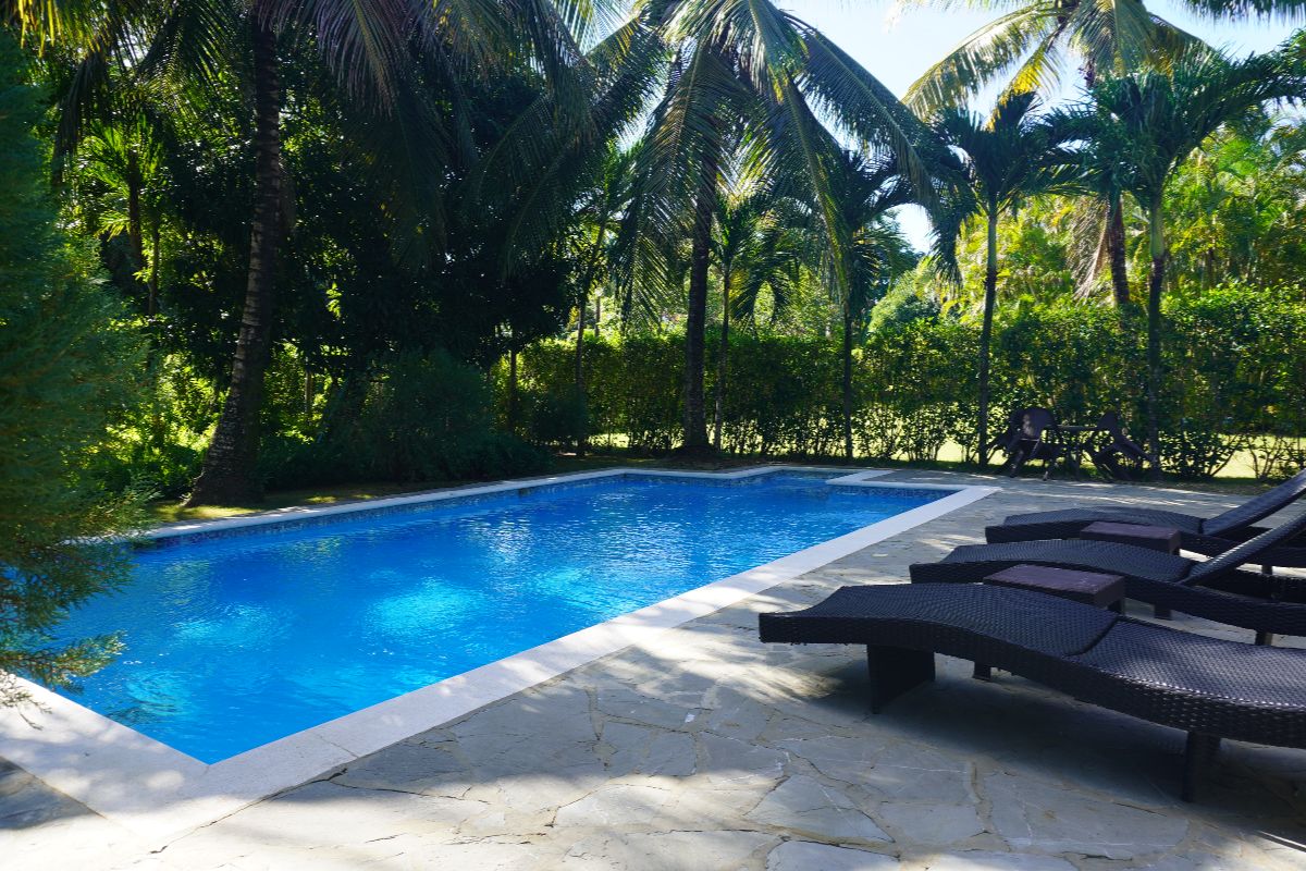 The extended covered terrace overlooks a large private pool, surrounded by lush, mature gardens offering cool shade — especially welcome during the warm Dominican summer months. 🌿⛱️